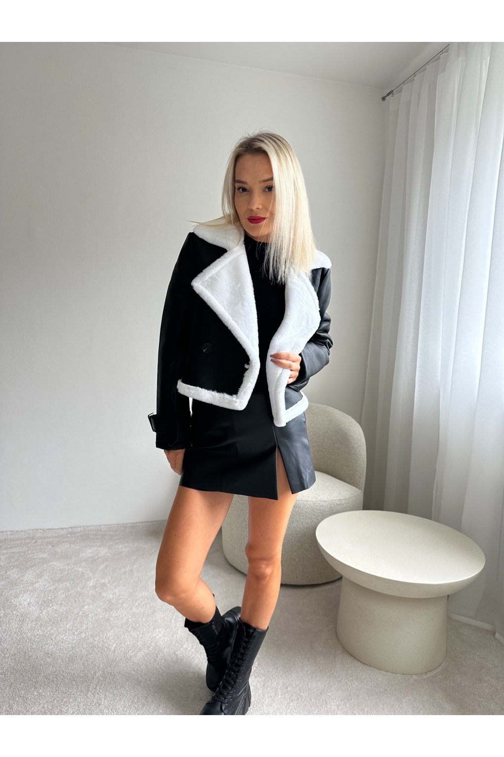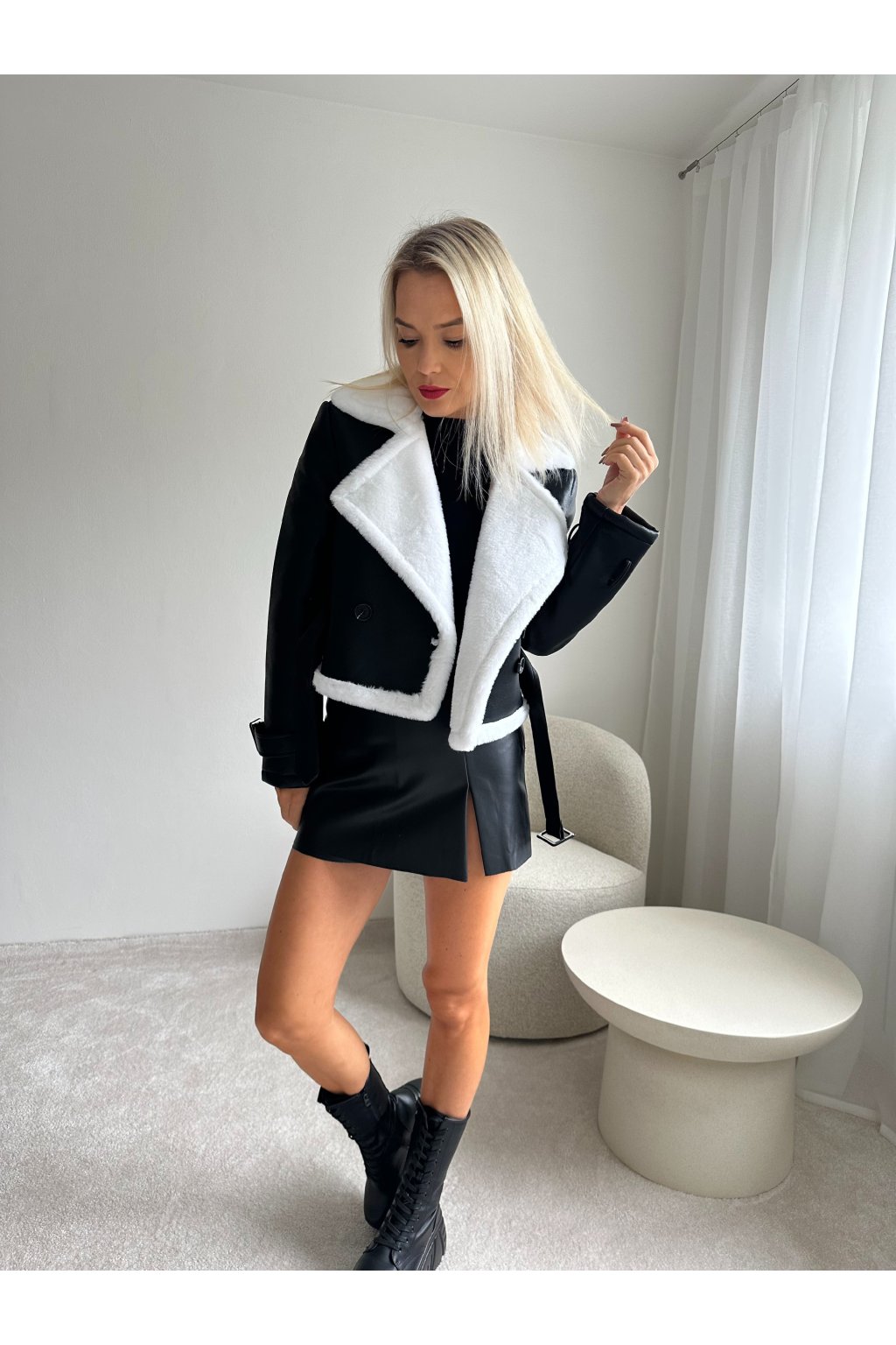 Koženková bunda s jemnou kožešinou uvnitř. Délka do pasu, zapínání na knoflík, ve spodním lemu opasek na stáhnutí.