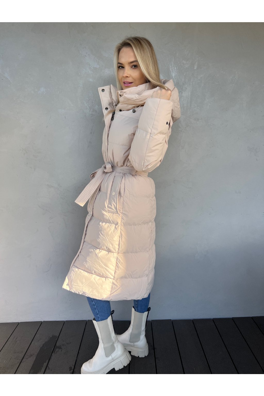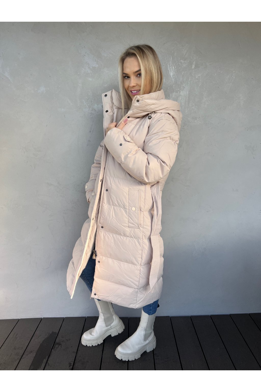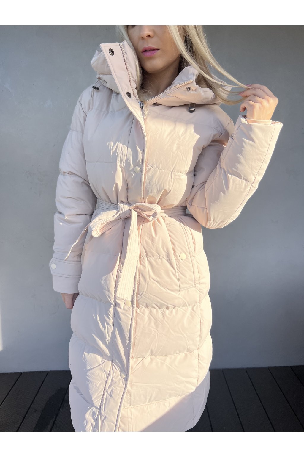 Luxusní dlouhá prošívaná bunda. Přiléhavý střih, velmi teplá! Kapuce s nastavitelnou stahovací gumičkou, stojatý rovný límec se zapínáním na patentky. Po stranách jsou kapsy na tlakové knoflíky, v pase je opasek na zavázání. Zapínání na zip a ochranná klopa na patentky.