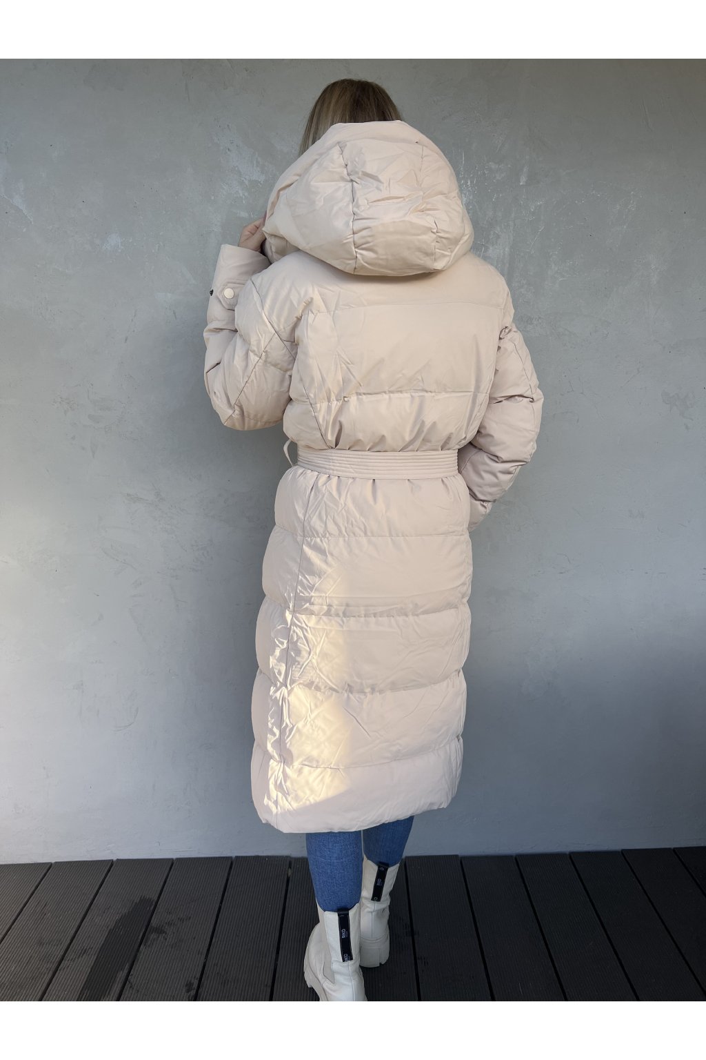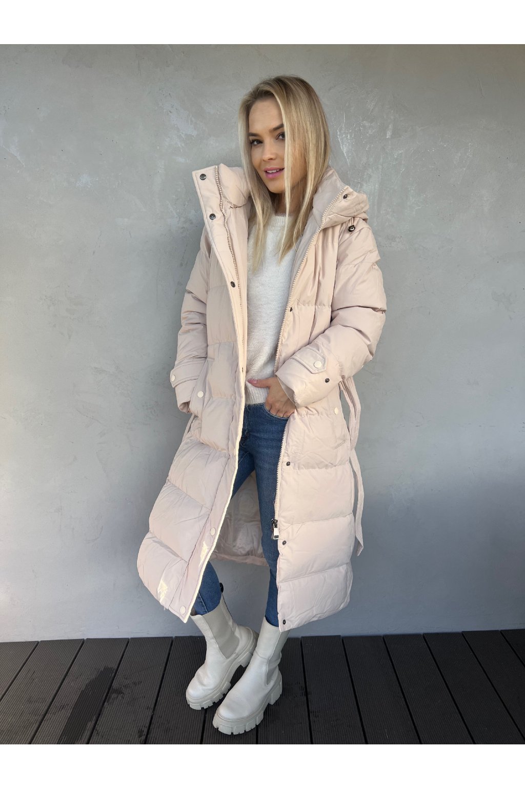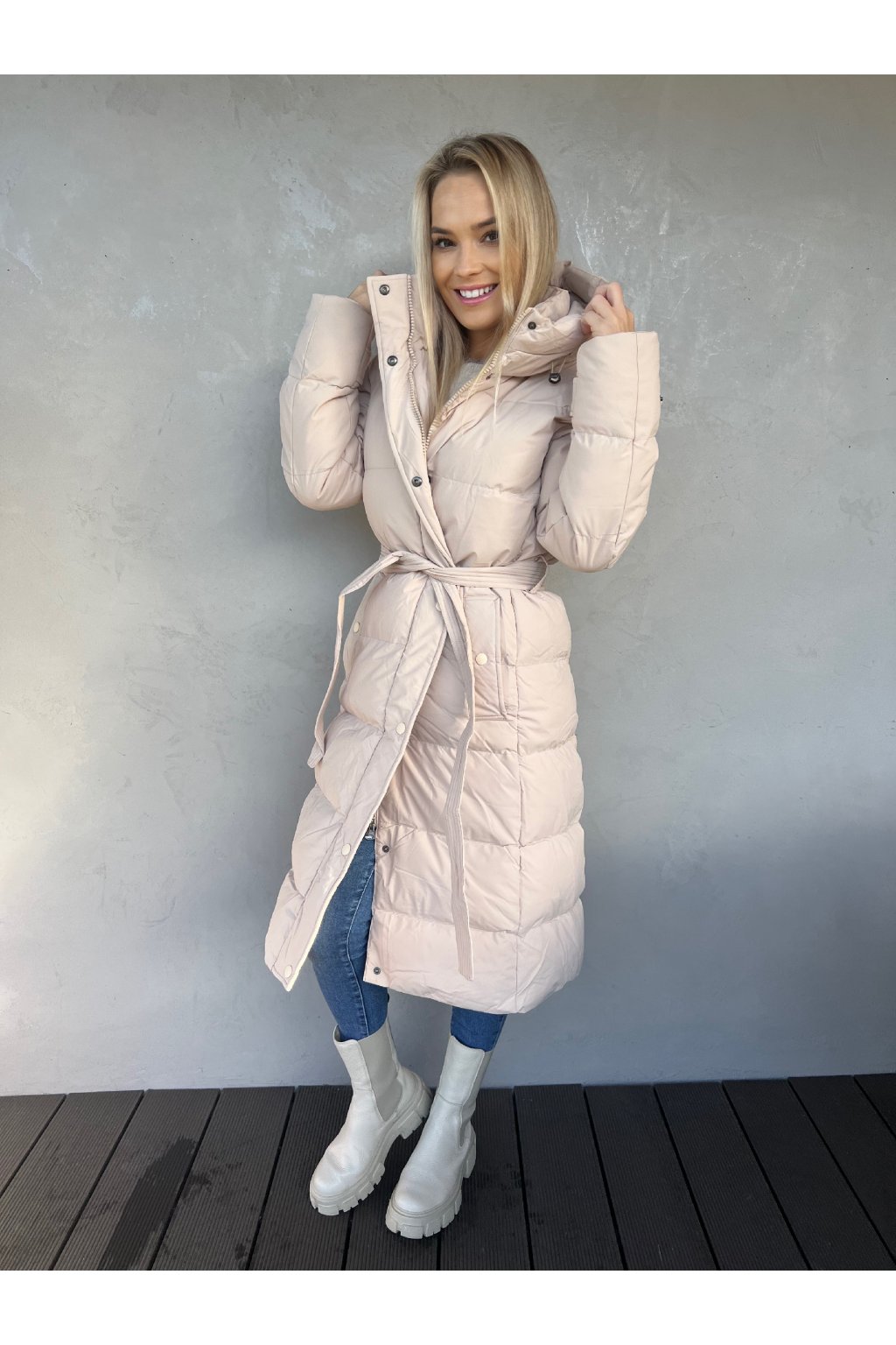 Luxusní dlouhá prošívaná bunda. Přiléhavý střih, velmi teplá! Kapuce s nastavitelnou stahovací gumičkou, stojatý rovný límec se zapínáním na patentky. Po stranách jsou kapsy na tlakové knoflíky, v pase je opasek na zavázání. Zapínání na zip a ochranná klopa na patentky.