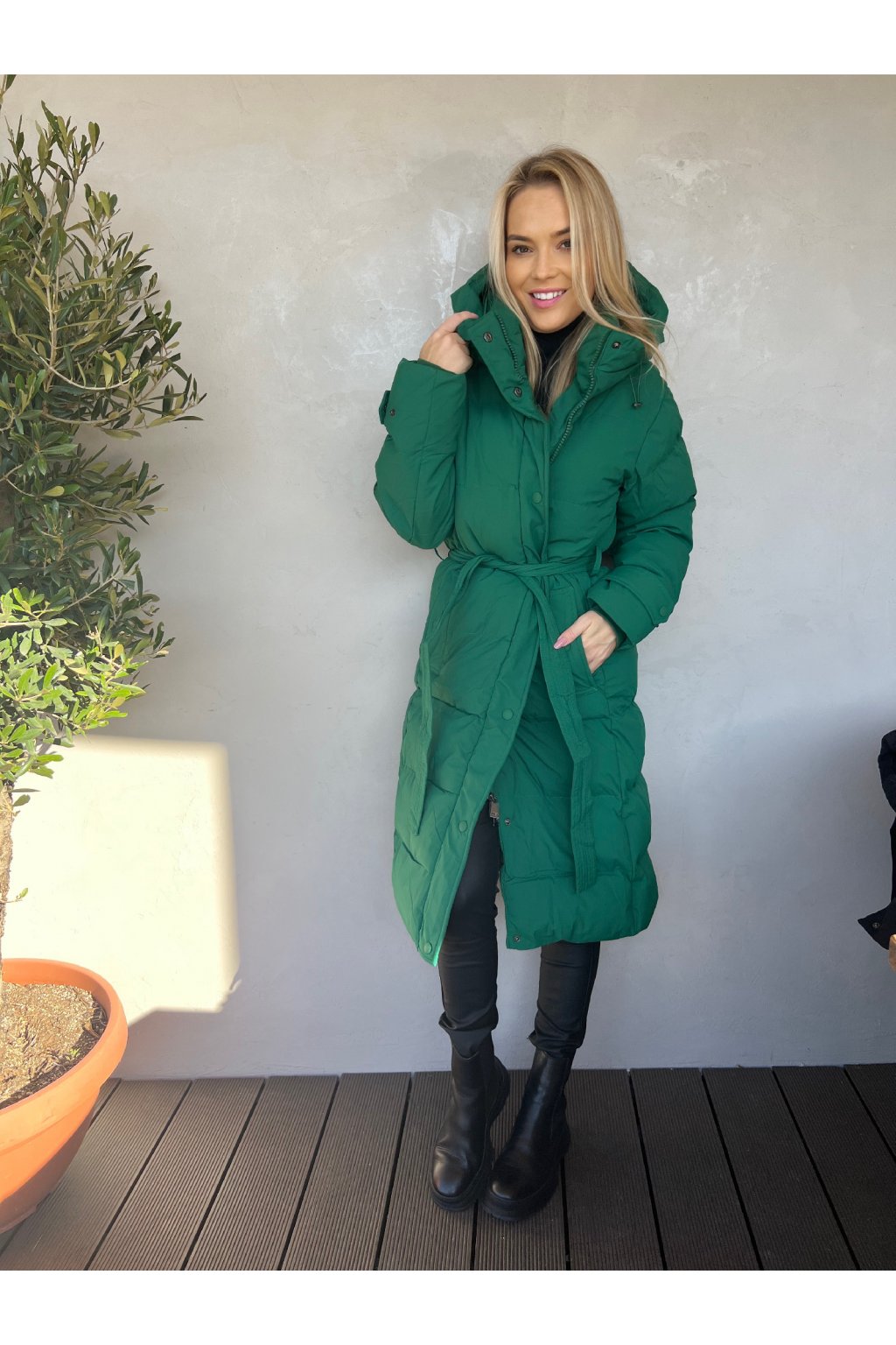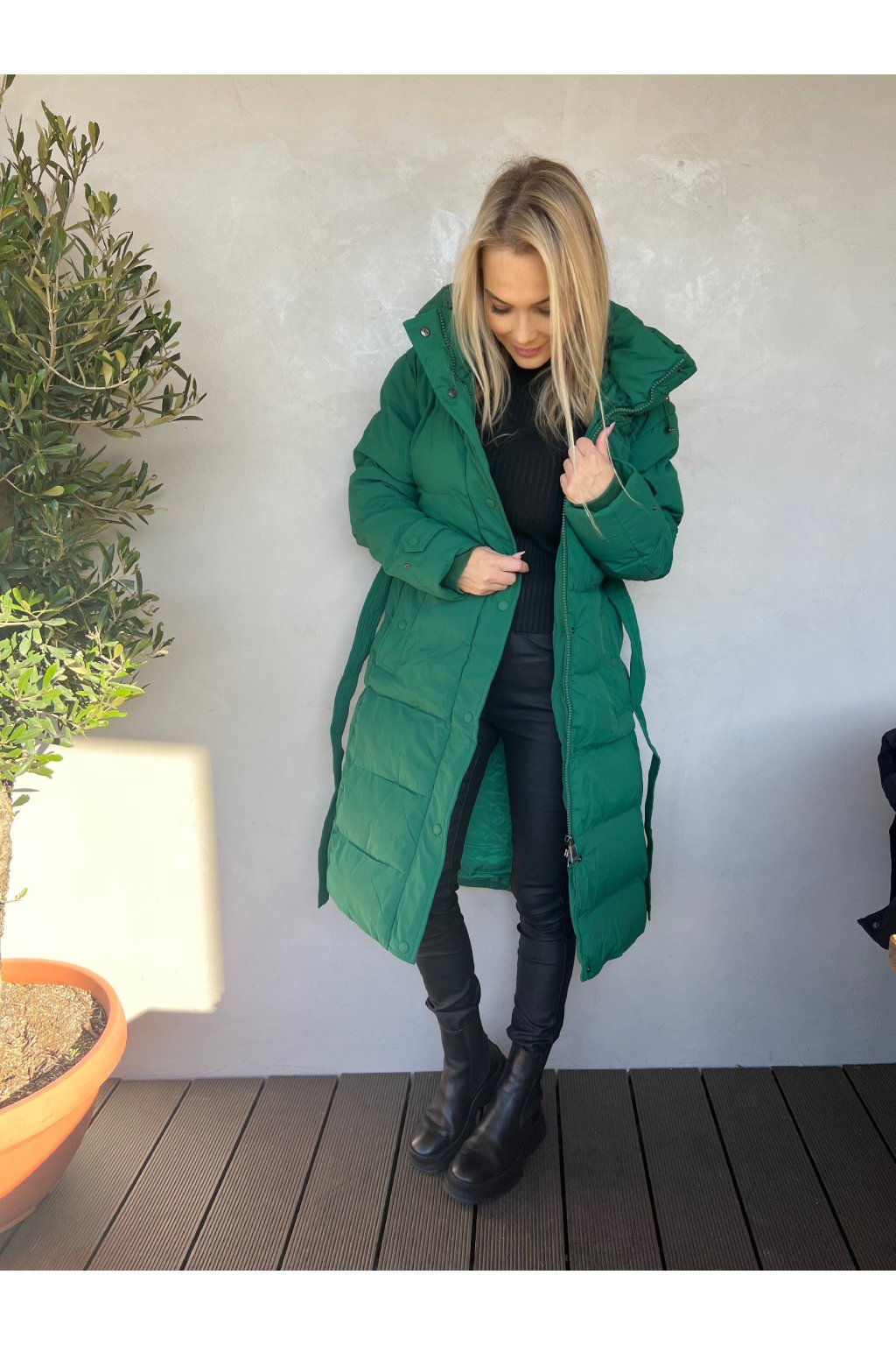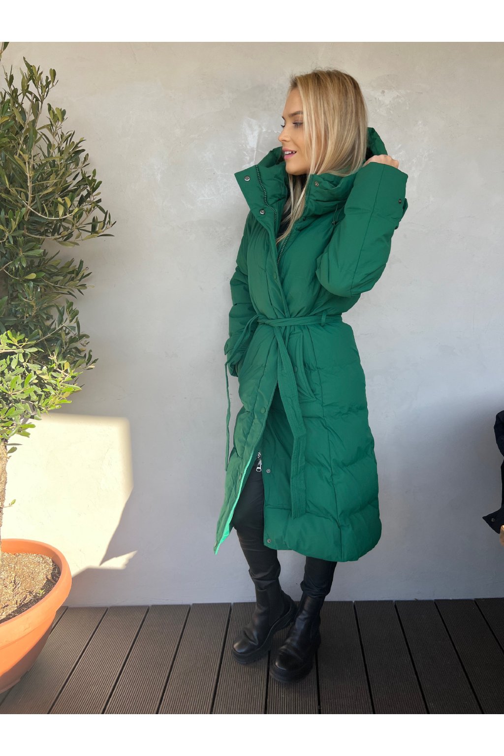 Luxusní dlouhá prošívaná bunda. Přiléhavý střih, velmi teplá! Kapuce s nastavitelnou stahovací gumičkou, stojatý rovný límec se zapínáním na patentky. Po stranách jsou kapsy na tlakové knoflíky, v pase je opasek na zavázání. Zapínání na zip a ochranná klopa na patentky.