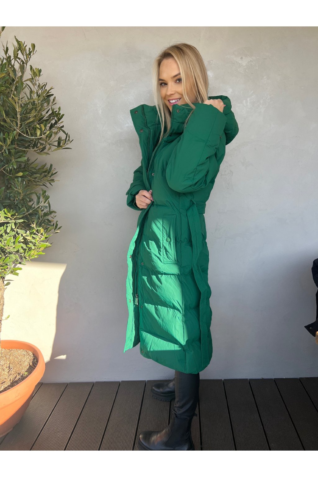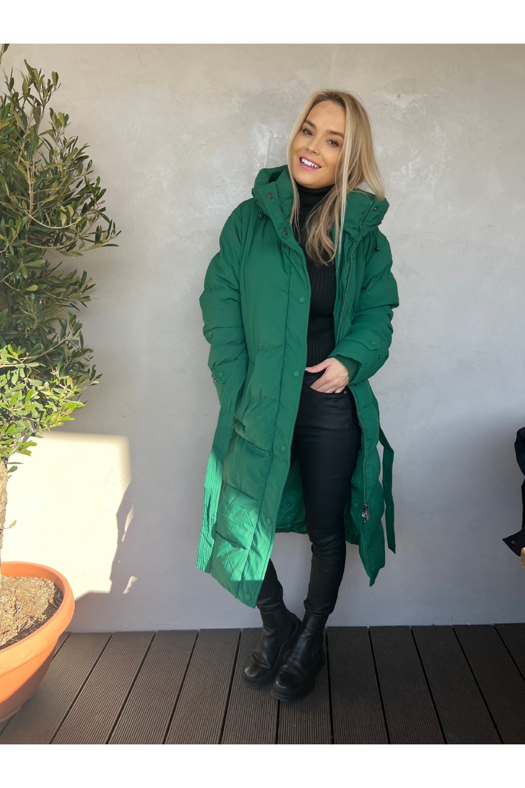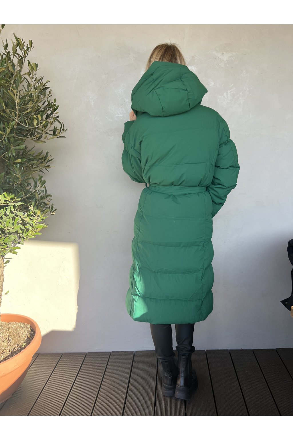 Luxusní dlouhá prošívaná bunda. Přiléhavý střih, velmi teplá! Kapuce s nastavitelnou stahovací gumičkou, stojatý rovný límec se zapínáním na patentky. Po stranách jsou kapsy na tlakové knoflíky, v pase je opasek na zavázání. Zapínání na zip a ochranná klopa na patentky.