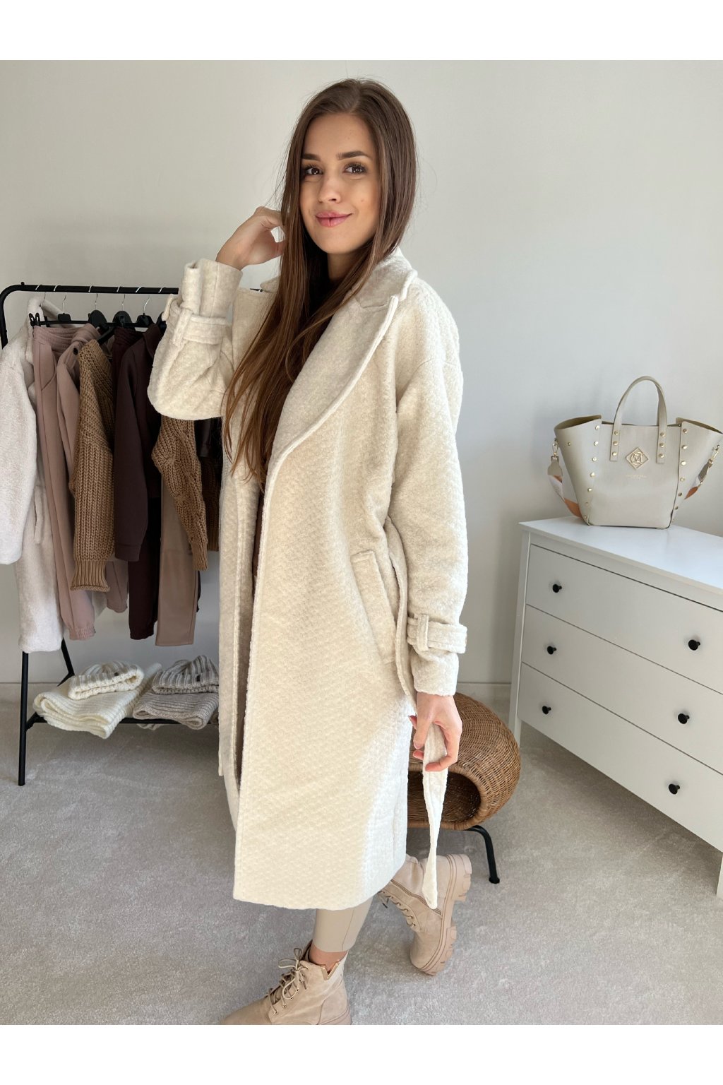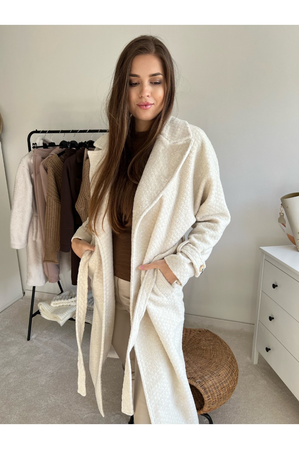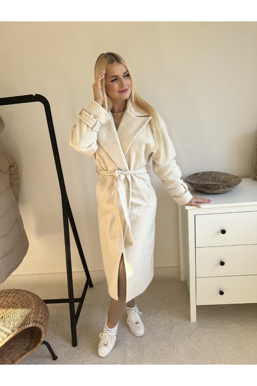 Hřejivý kabátek s jemným vzorem. Široký límec, v pase pásek na uvázání. Na rukávech ozdobné knoflíky.