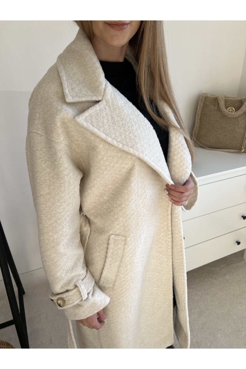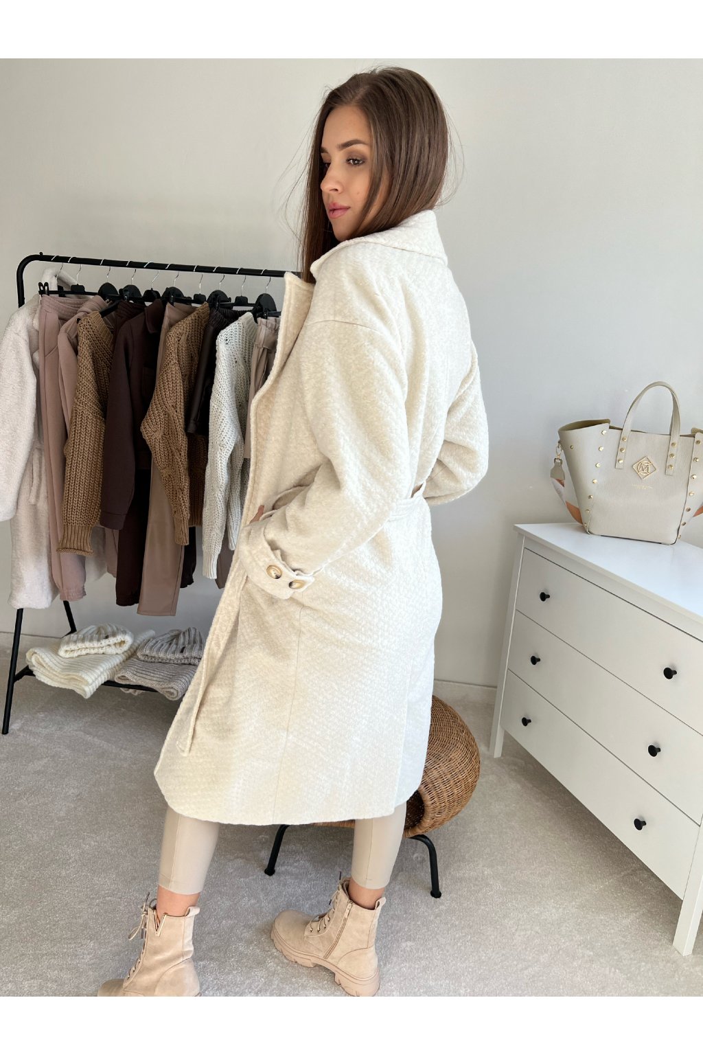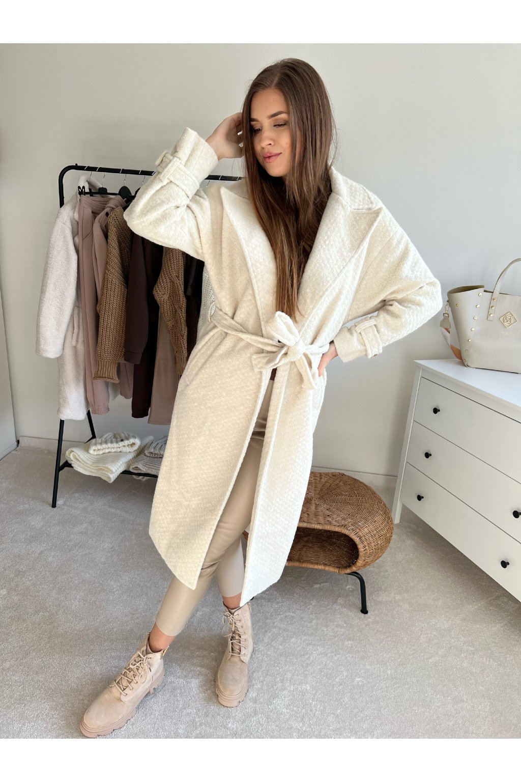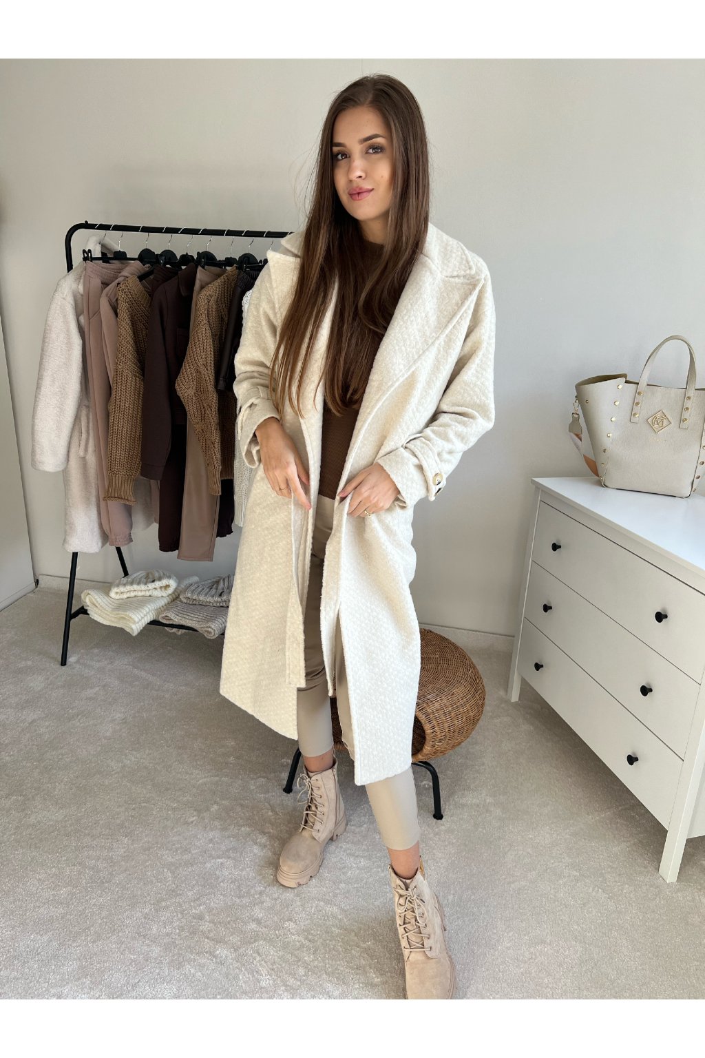 Hřejivý kabátek s jemným vzorem. Široký límec, v pase pásek na uvázání. Na rukávech ozdobné knoflíky.