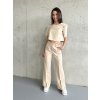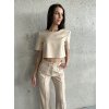 Stylový komplet, který se skládá z top s krátkým rukávem a kalhot se širokými nohavicemi. Top má na ramenou vycpávky - hezky drží tvar. Kalhoty mají široké nohavice, zapínání v pase na knoflík a zip. Stylový kousek, který můžete kombinovat jak s teniskami, tak i s elegantní obuví. Nabízíme ve velikosti S a M.