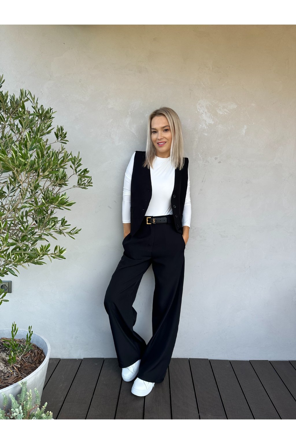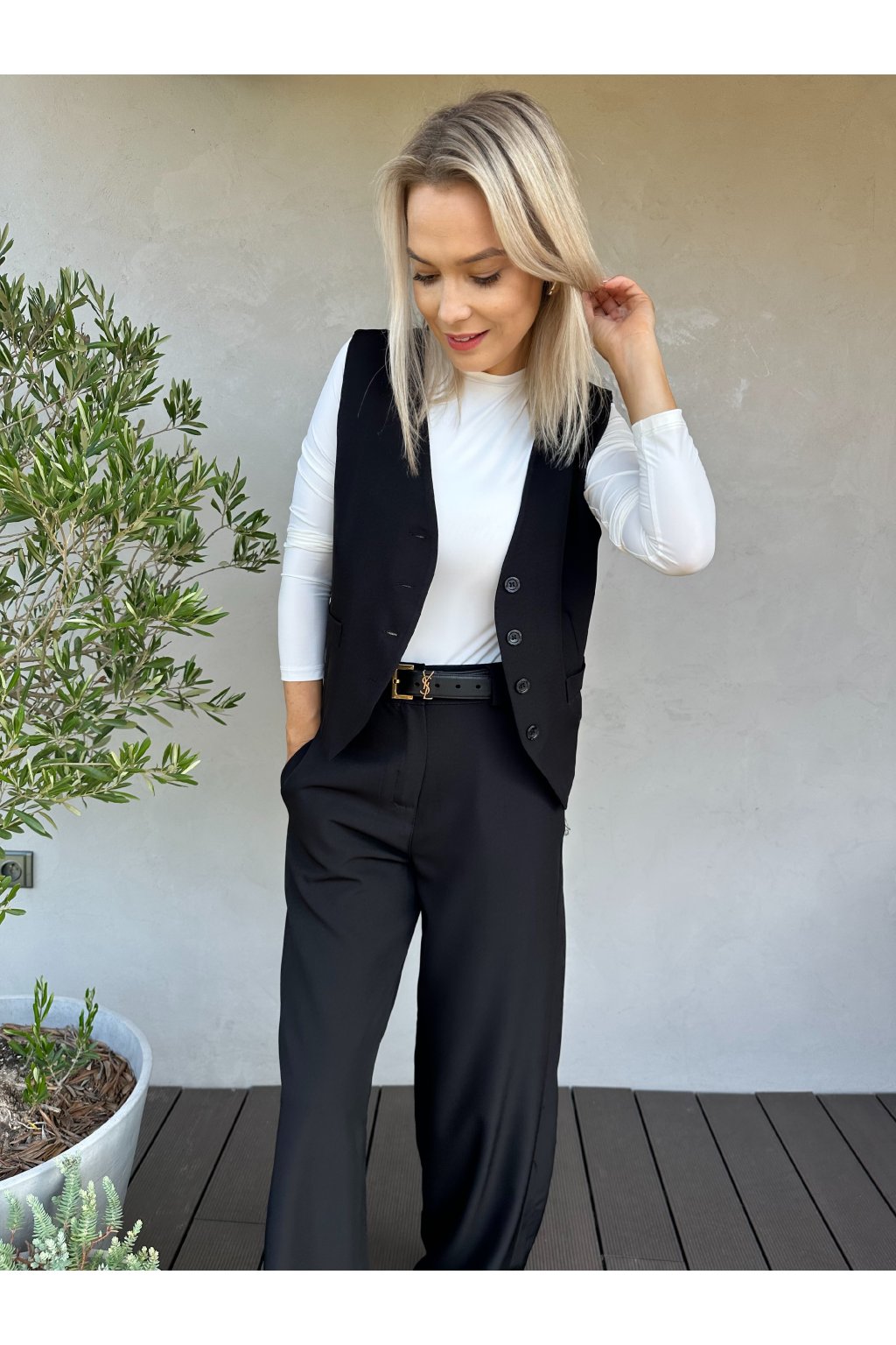 Stylová vesta a kalhoty se širokými nohavicemi.