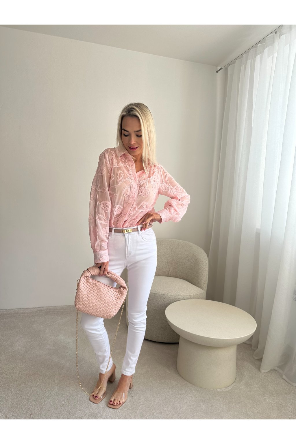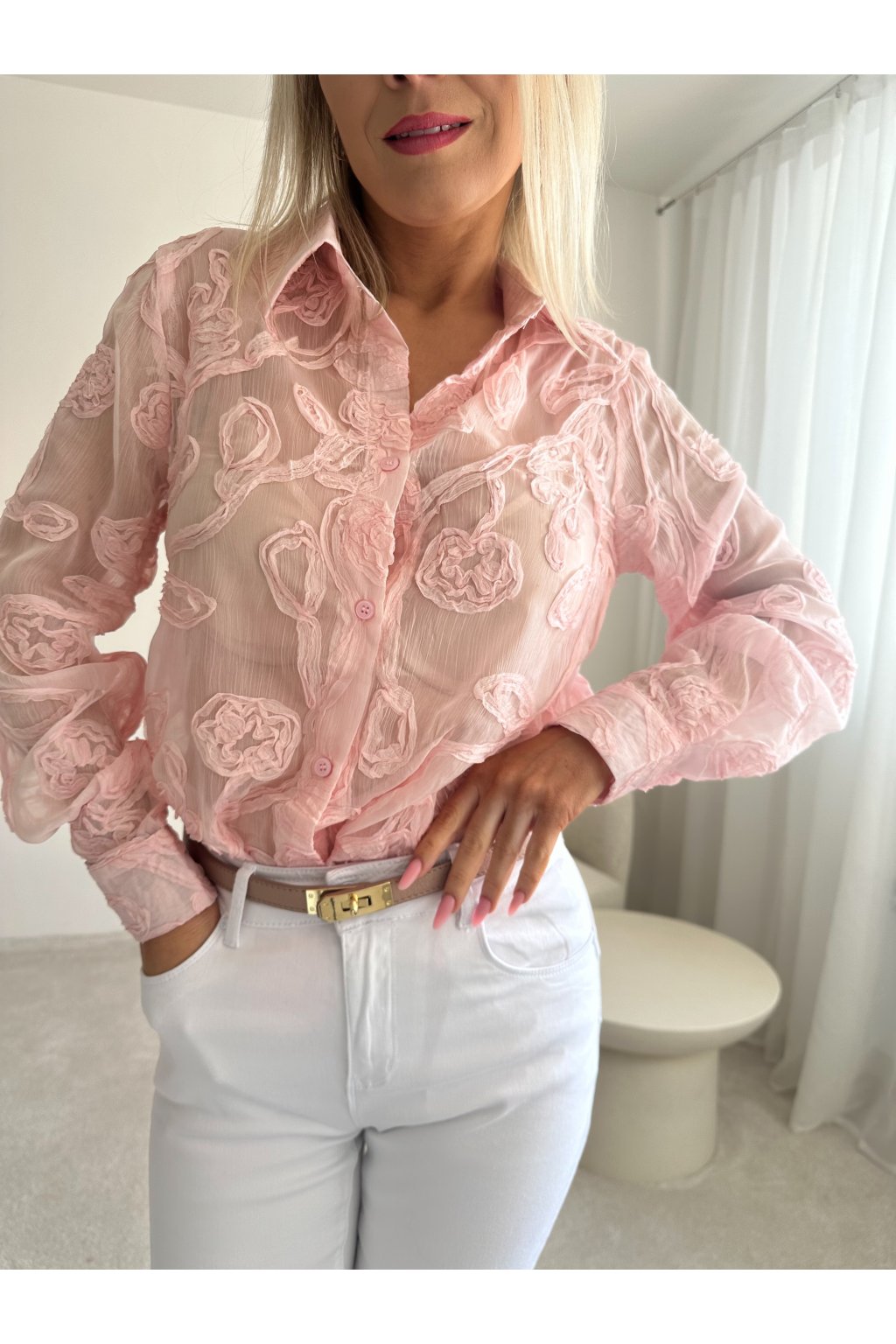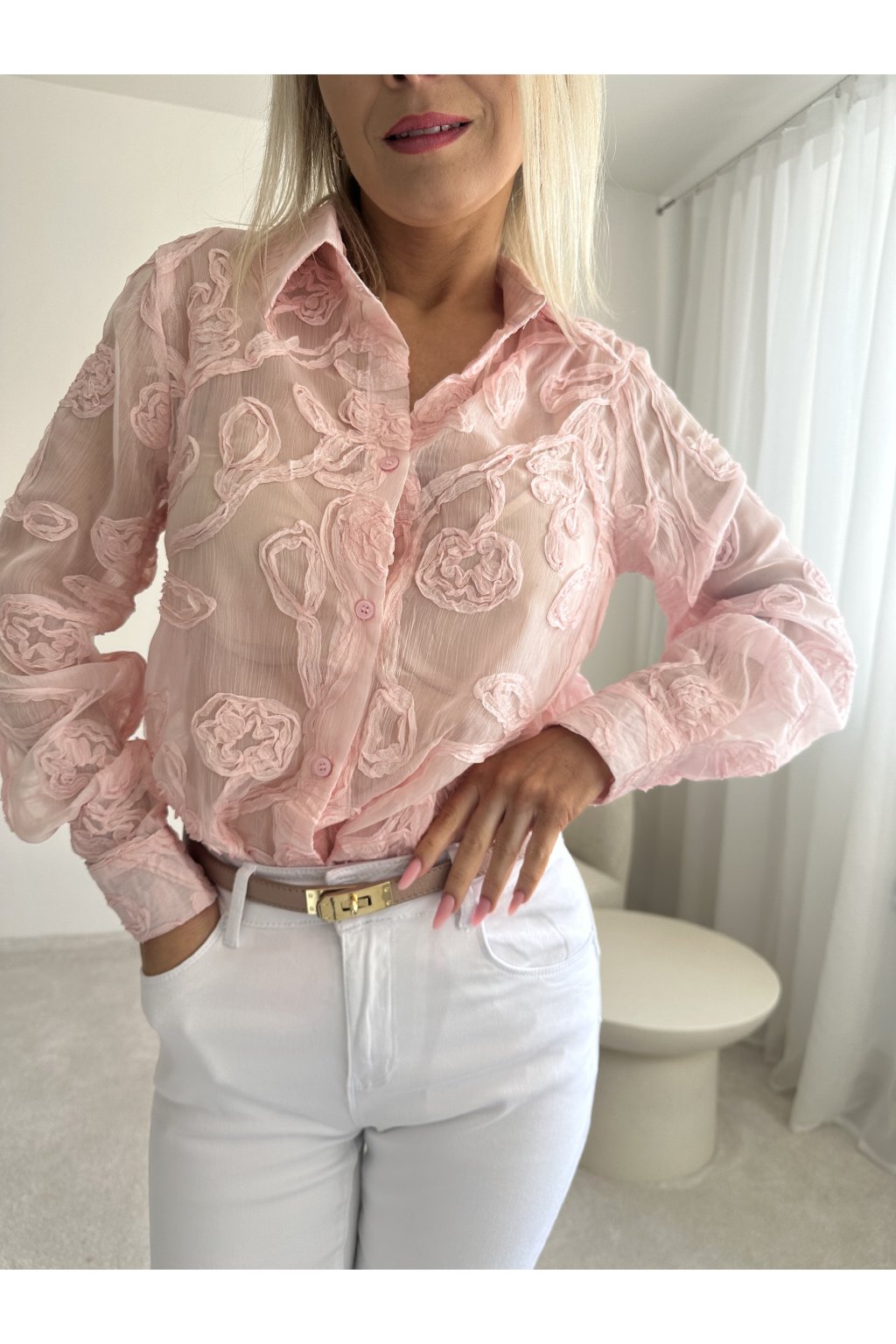 Košile má vzdušný materiál, lehce průsvitný.