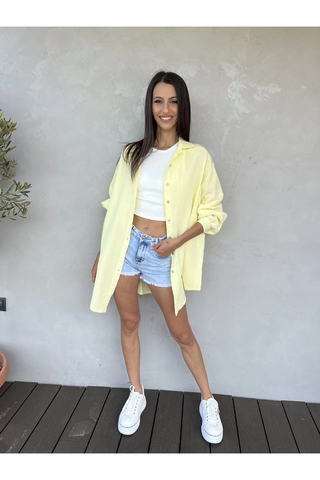 Tato oversize košile z mušelínu je must have kousek jara/léta. Můžete jí nosit na několik způsobů - za nás vypadá nejlépe rozeplá s crop topem. Dá se také využít jako přehoz na plavky. Opravdu multifunkční kousek, který si zamilujete! Materiál je neskutečně příjemný.