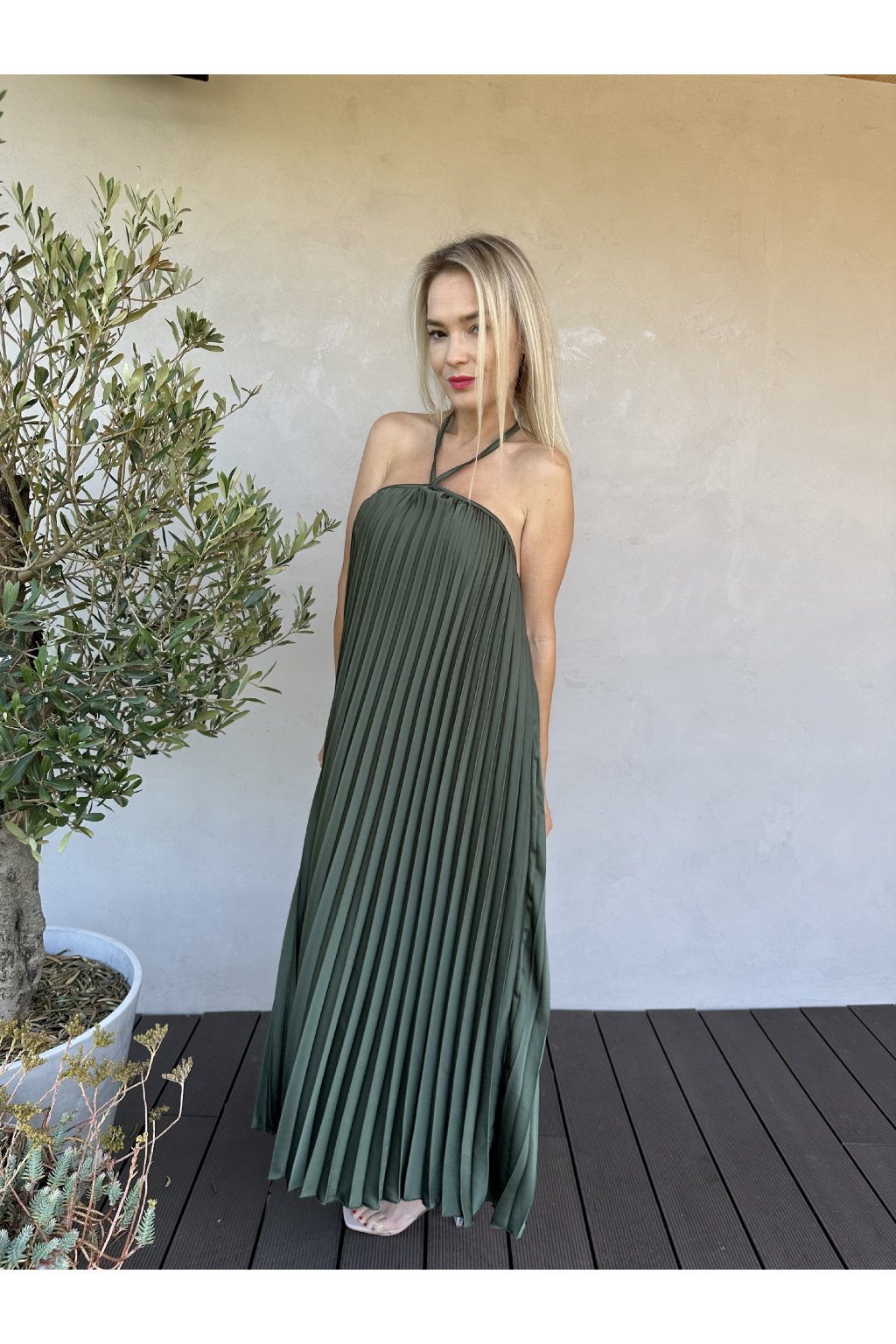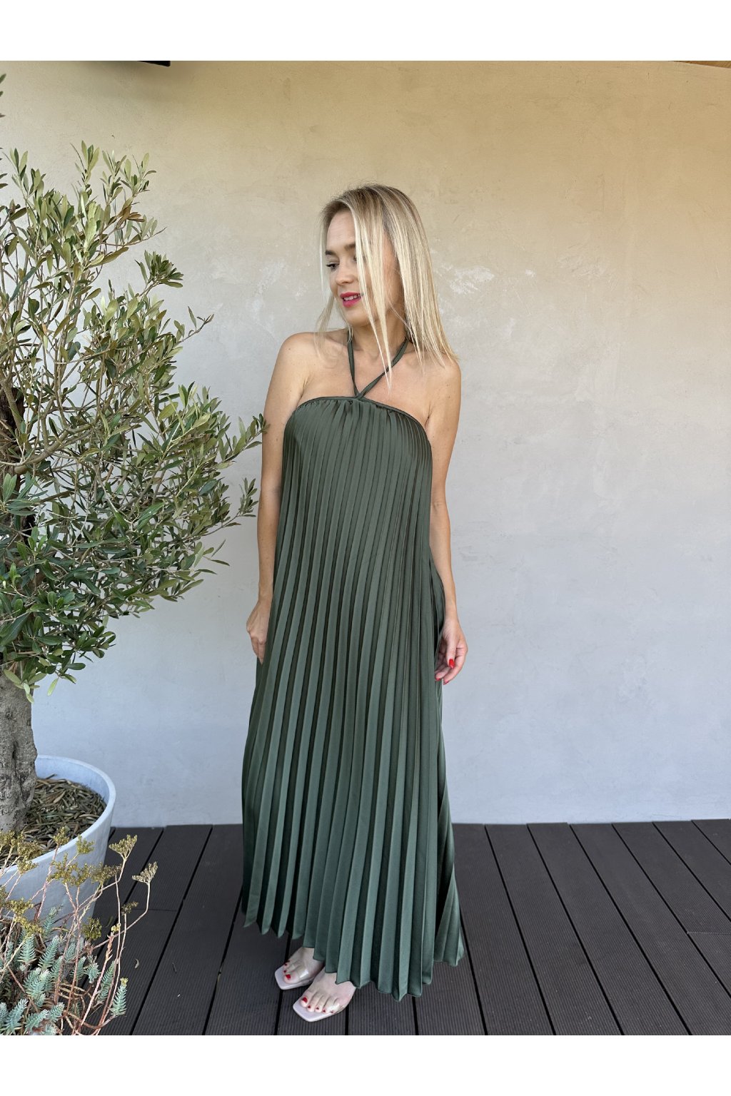 Plisované šaty s odhalenými zády.