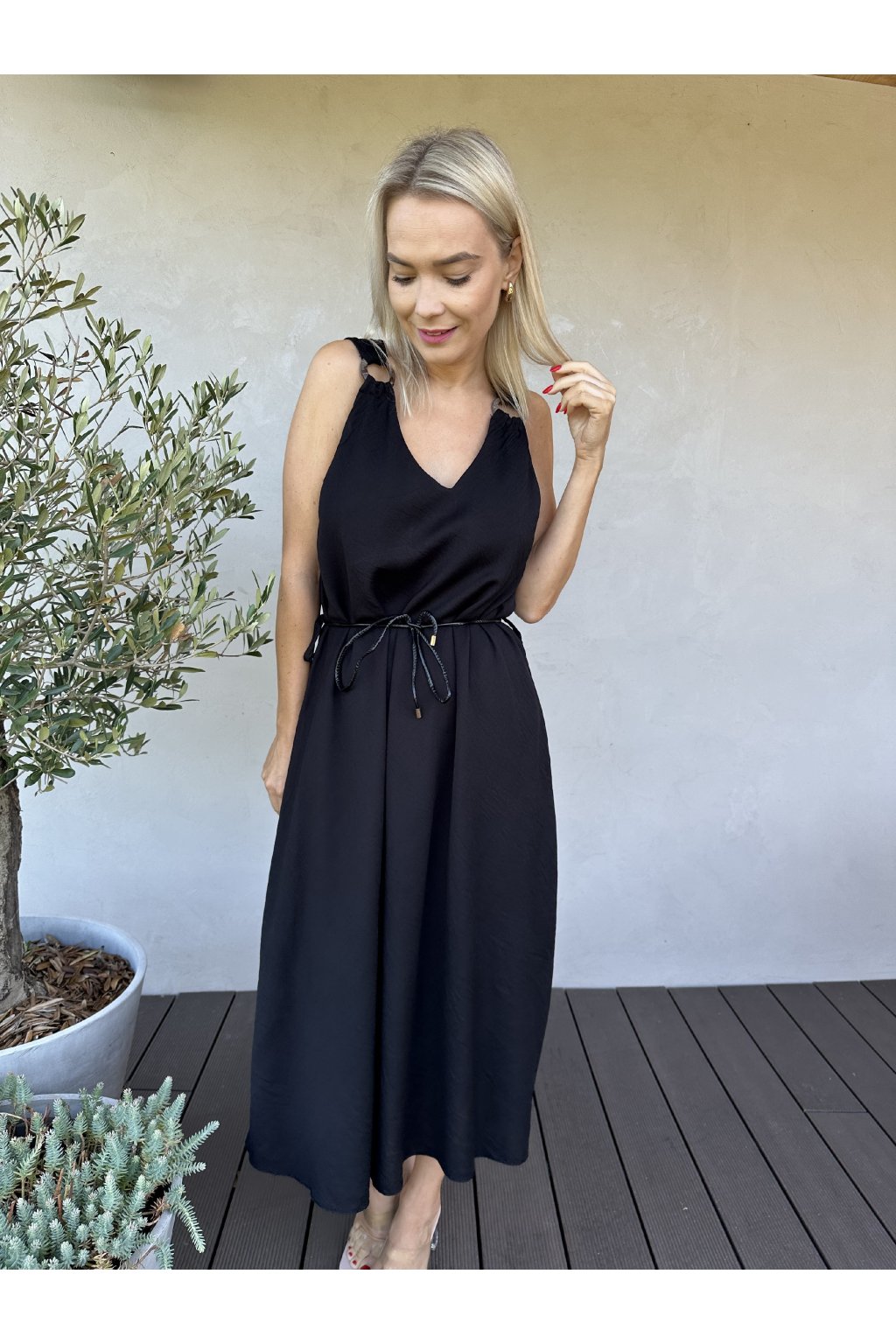 Letní šaty na širokých ramínkách. Ramínka mají ozdobu. Součástí je i opasek. Šaty mají volný střih a sednou na každou velikost. Jsou velmi pohodlné a mají midi délku.