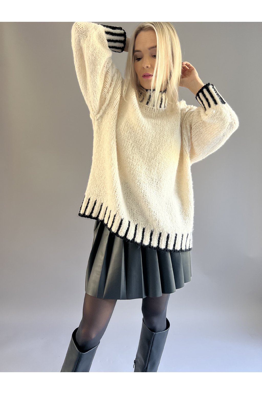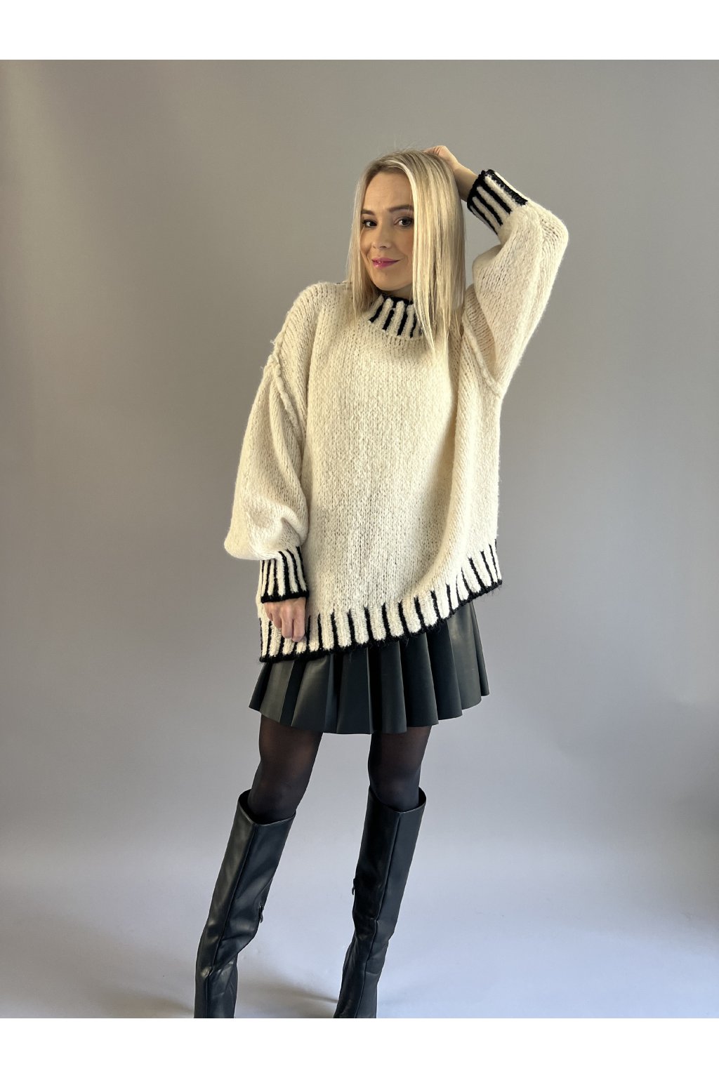Stylový kousek z kvalitního materiálu. Délka pod zadek, skvěle vypadá k legínám nebo k sukni. U krku stojáček, rukávy i spodní lem zakončeny černými detaily. Jena velikost - sedí na S , M , i L.