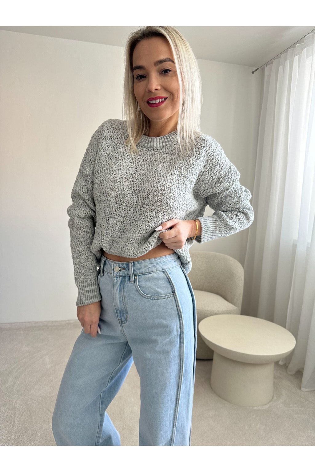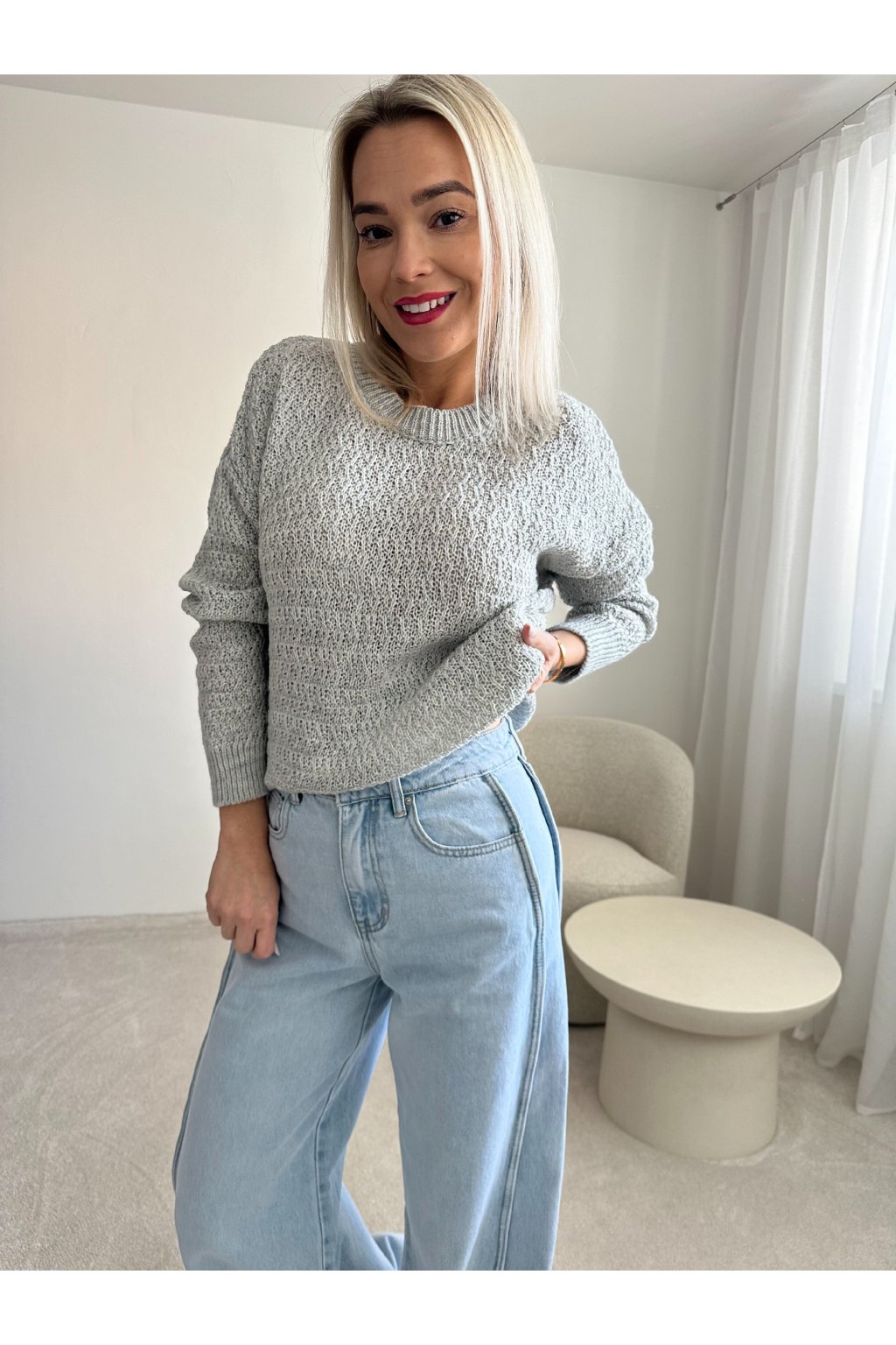 Svetr s jemným pleteným vzorem. Má univerzální velikost - ideálně sedne na S až M. Rukávy jsou zakončené širokým lemem, výstřih ke krku.